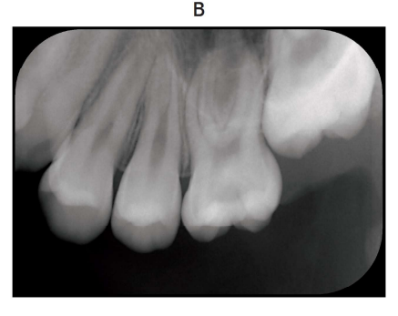 初診時の口腔内写真(別冊午後No.31 A)とエックス線画像(別冊午後No.31 B)を別に示す。