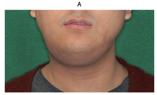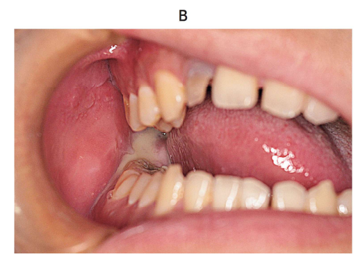 確定診断のために局所麻酔下で処置を行った。初診時の口腔内写真(別冊午後No.4 A) と処置後に行った操作の写真(別冊午後No.4 B) を別に示す。