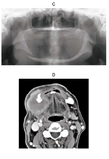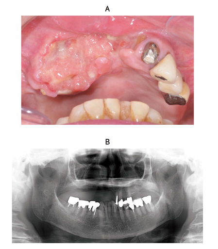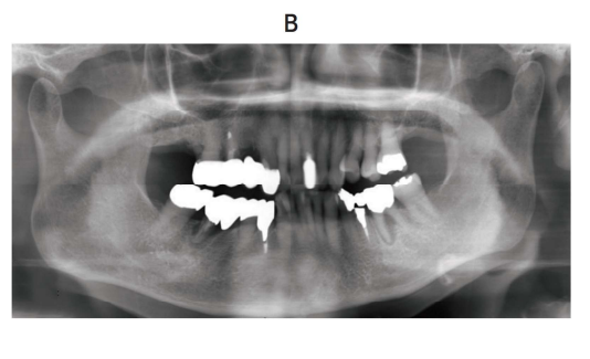 デノスマブは骨粗鬆症の薬で顎骨壊死の副作用がある。薬剤関連顎骨壊死 (MRONJ)である。