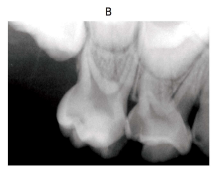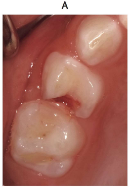 萌出してから、むし歯になったと考えられる。写真から、白いところはむし歯になりかけと考えられる。広範囲にわたってCOの状態。