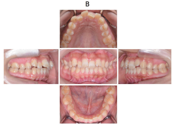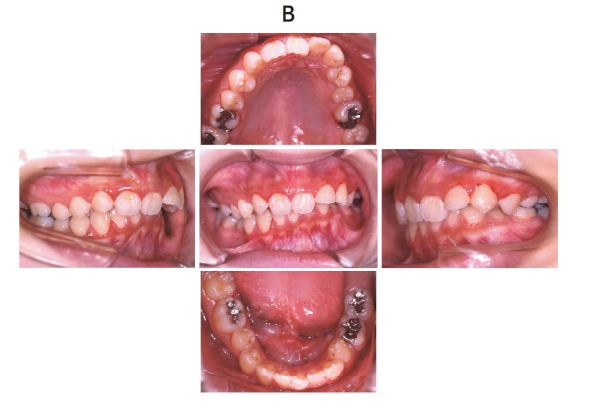 b 大臼歯関係はAngleは上下の6番を見る。両側とも上顎6番が下顎6番より近心にあるのでAngleⅡ級。