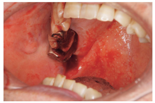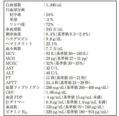 62 歳の男性。上顎右側臼歯部歯肉からの出血を主訴として来院した。 2 か月前からブラッシング時の出血を自覚していたが、自然に止血するためそのままにしてたところ、昨夜のブラッシング後からの出血が止まらないという。 3 年前から降圧薬を服用し、 3 か月前から全身倦怠感を自覚している。体温 37.5℃、脈拍100/分、血圧 130/88 mmHg であった。初診時の口腔内写真(別冊No. 23)を別に示す。血液検査の結果を表に示す。